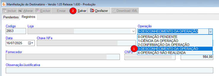 - Selecione a opção "3-desconhecimento da operação" ou a opção desejada