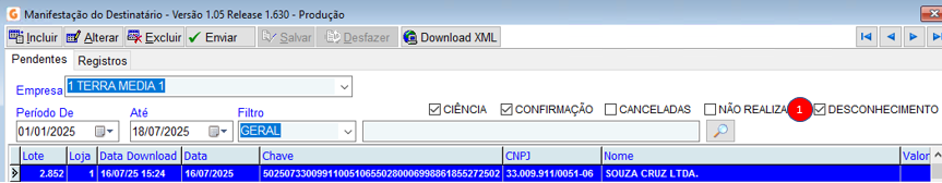 - Clique com botão direito no cabeçalho da tela e selecione a opção: Manifestação Dest.Conf.Op