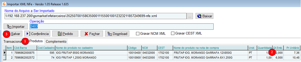 - No campo *Qt.Emb* informe a quantidade contida na embalagem. Se for em unidade, deverá estar sempre *1*