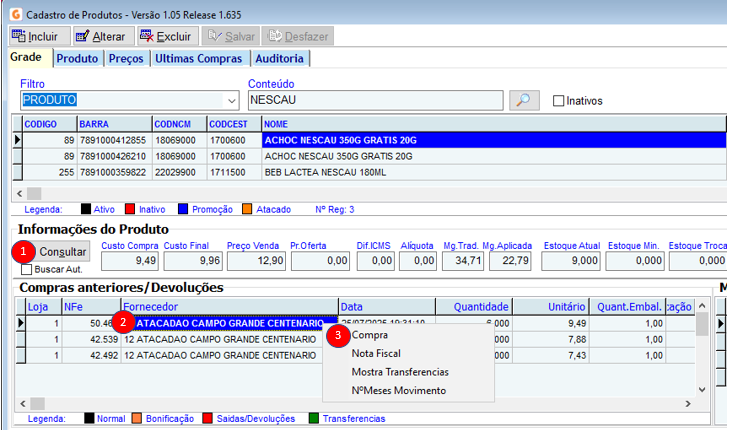 - Localize o item no cadastro do produto, clique sobre o mesmo e clique no *botão consultar*