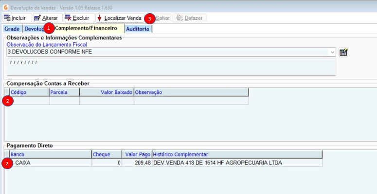 - Informe a forma de pagamento da devolução: se for pagamento direto, informar o caixa. Se o cliente tiver recebimento pendente poderá fazer a compensação com o contas a receber do mesmo
