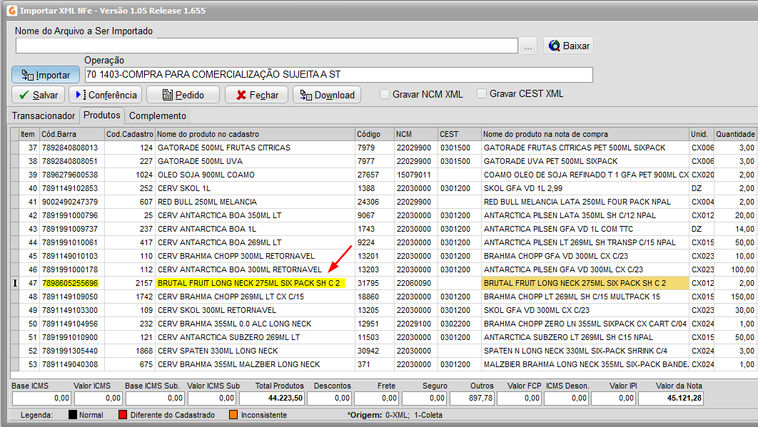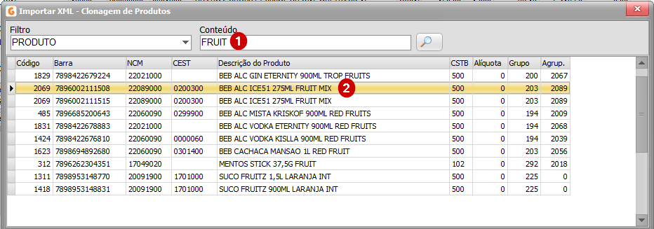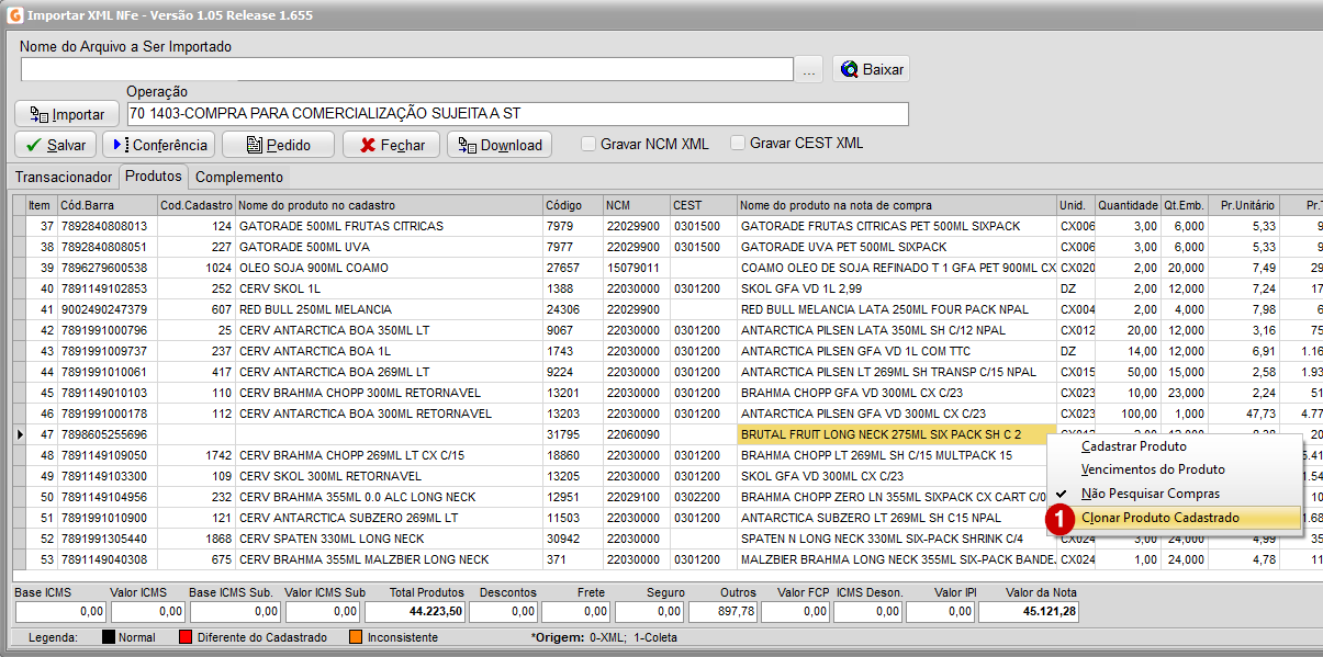 - O primeiro passo é selecionar o produto que não está cadastrado na nota de compra, clique com o botão direito do mouse e selecione a opção Clonar Produto Cadastrado