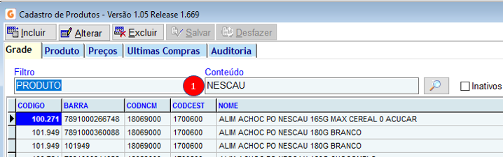 - Informe o código ou nome do produto desejado e pesquise na LUPA