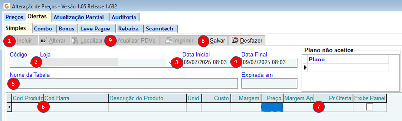 Acesso no menu: /faturamento/alteração de preços/aba ofertas/aba simples
