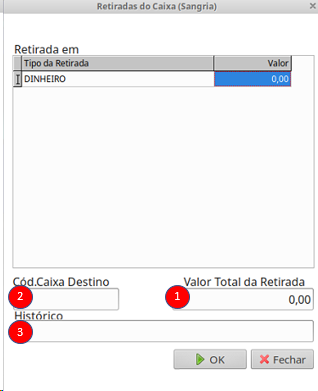 - O campo Cód. Caixa Destino é o caixa cofre que receberá os valores após a retirada