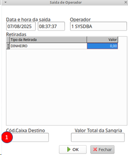 - Confirme os valores e pressione ENTER, o campo Cód. Caixa Destino é o caixa cofre que receberá os valores após o fechamento do caixa diário